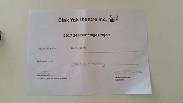 Aims: Keep the dialogue under control – it’s a two hander, so fifteen odd minutes is potentially a lot of lines to learn. Internalise – pointed looks, guarded reactions, Pinteresque pauses of mysterious intent. Chuck in some story hooks, set in questions for the audience to want to know the answer to. Who are these people? Where are they? What’s happened? Stop blogging.